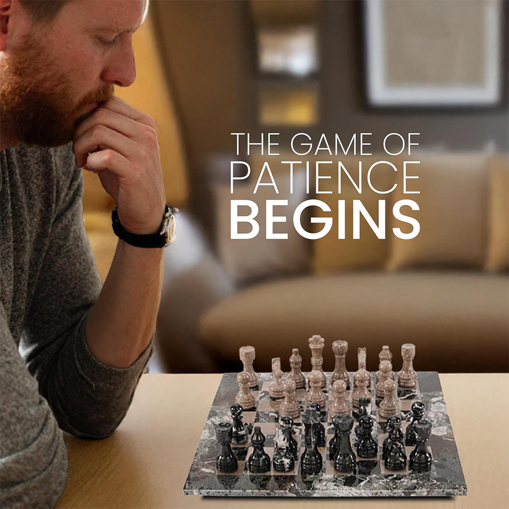 Marble 15" Inches Chess Set Black Zebra & Oceanic Chess Board with Storage Box Extra Queen