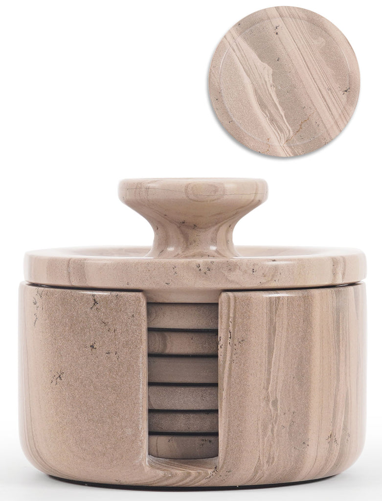 Marble Coasters for Drinks - Set of 6 Handmade Round 3.5" Stone Coasters with Holder