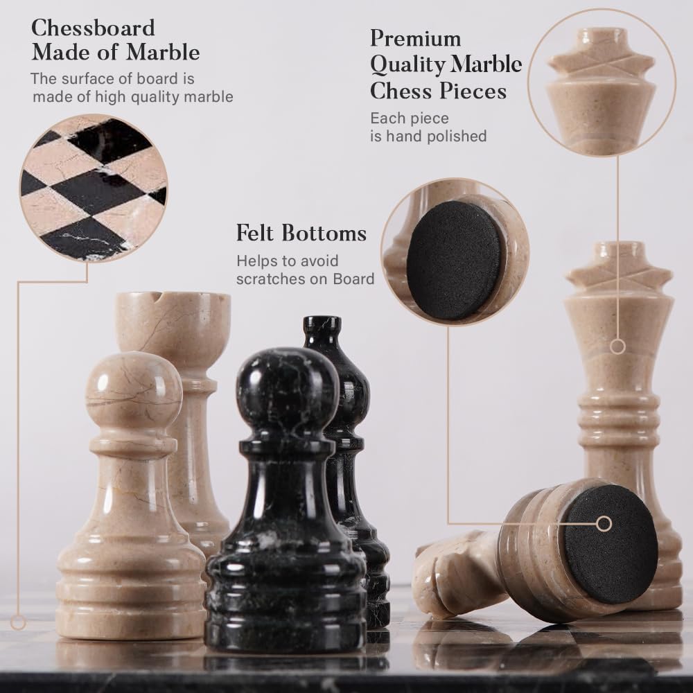 - Complete Chess Set: Includes a 15 inches handcrafted marble chess board, 32 + 2 extra queens chess pieces, and a COMPLIMENTARY STORAGE BOX for safe keeping.