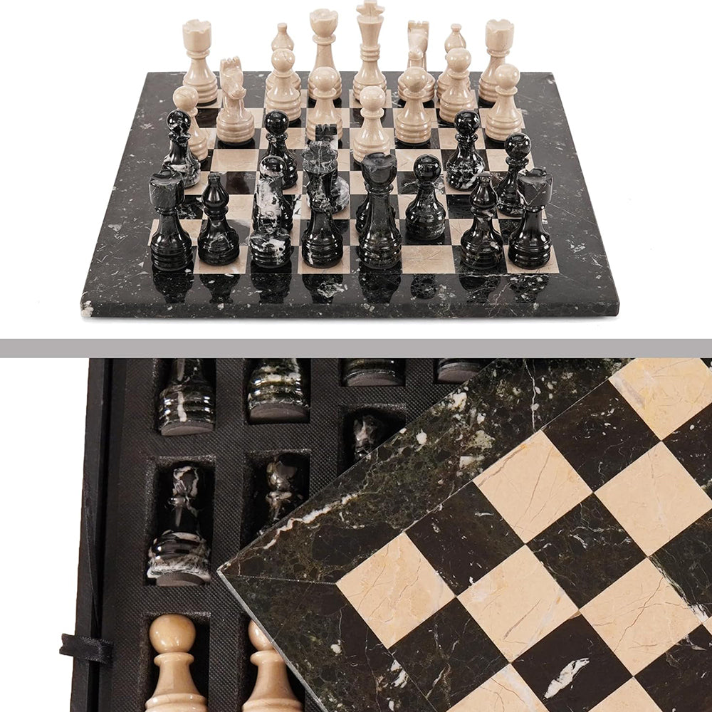 Marble 15" Inches Chess Set Black Zebra & Verona Chess Board with Storage Box Extra Queen